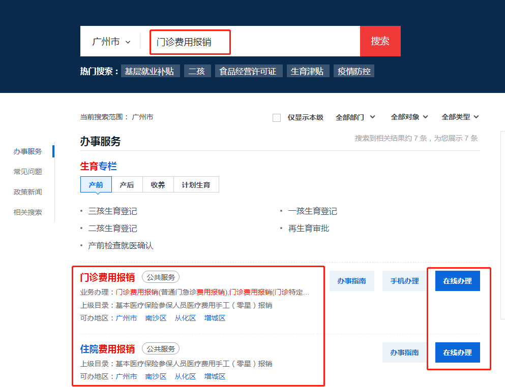 4.办事站点选择“广州市”(请勿选择到区),并根据不同的情形选择具体业务情形,点击“在线办理”。