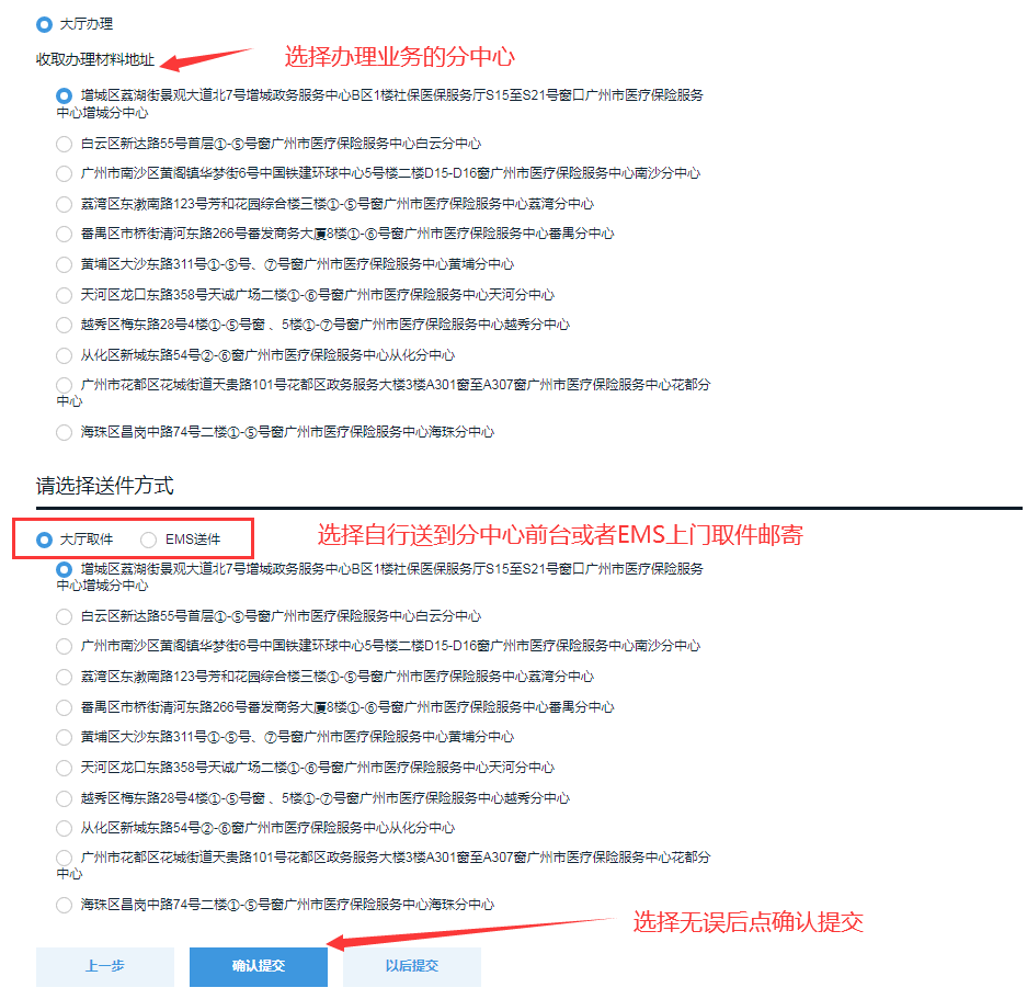 8.在办理方式选择界面,根据申请人需要选择“大厅办理”及“大厅取件”的服务网点(后续在选择的网点递交资料),点击“确认提交”完成业务办理。