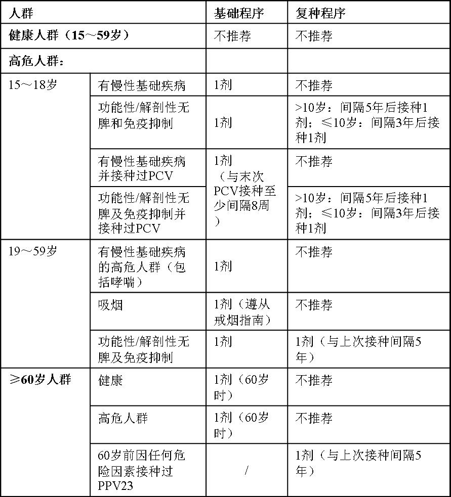 2.再次接种:综合世界卫生组织的推荐和各国应用实践,不推荐常规进行23价肺炎球菌多糖疫苗的复种,也不推荐多次接种23价肺炎球菌多糖疫苗,只推荐功能性/解剖性无脾和免疫抑制等特定高危人群的复种。不同年龄、健康状况人群23价肺炎球菌多糖疫苗的推荐程序(详见附表)。