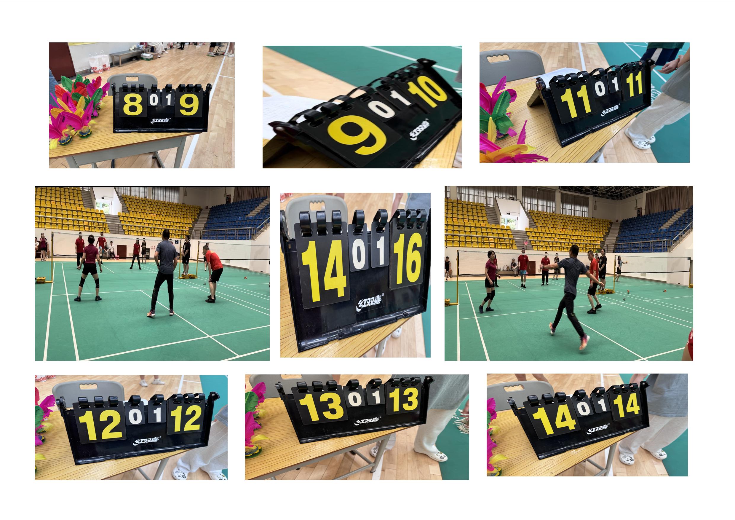 本届毽球比赛采用分组交叉淘汰赛制,分两个阶段进行,共设置6个奖项。在上午的小组循环赛中,我们的毽球队迎战的分别是上届毽球比赛第一名的机关一A队、第五名的附属中小学,以及会计学院和信息学院毽球队。经过上午艰难激烈的比拼,我们最终取得了进入下午第二阶段交叉淘汰赛的入场券。