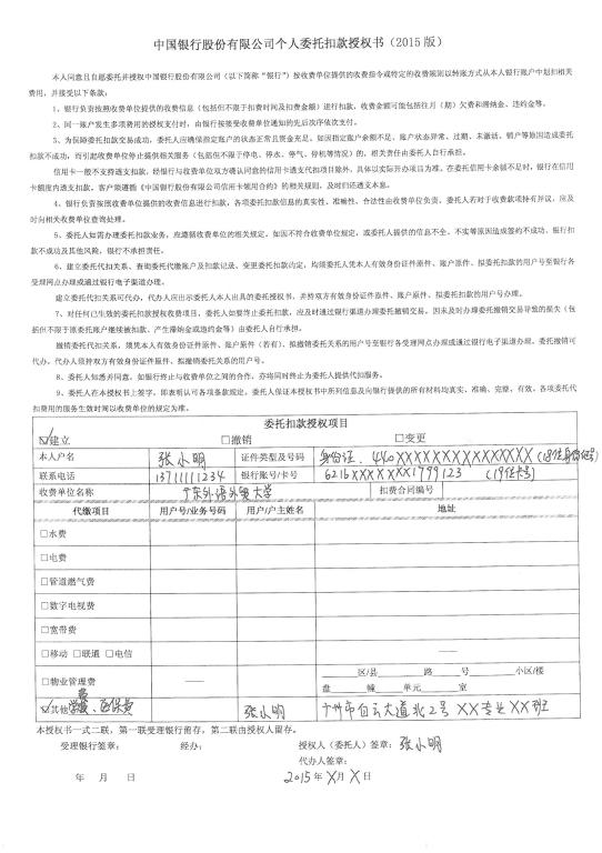 中国银行股份有限公司个人委托扣款授权书(2015版)填写范例