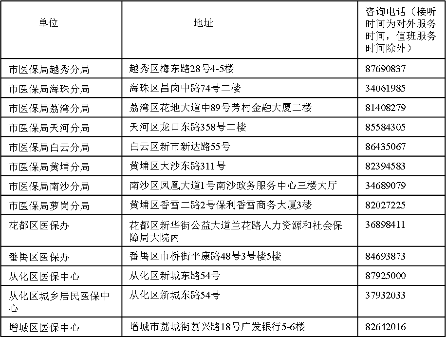 对外服务时间:1.直属分局为星期一~星期五:上午9:00~12:00、中午12:00~14:00(值班服务)、下午14:00~17:00,法定节假日除外;(越秀分局星期六上午9:00~12:00值班服务;南沙分局为星期一~星期五:上午9:00~12:00、下午13:00~17:00,星期五下午15:30~17:00内部学习时间,不对外办公。) 2.花都区、番禺区、从化区及增城区医保经办机构为星期一~星期五上午8:30~12:00、下午14:30~17:30。