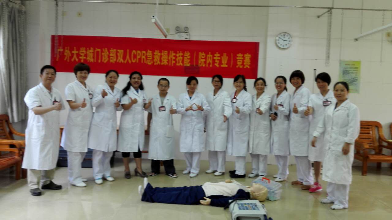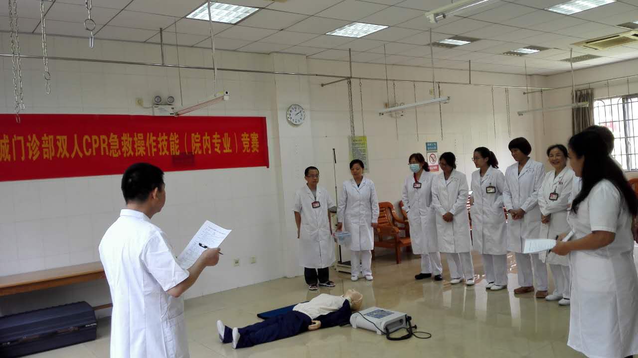 下午2:00南校门诊部全体医务人员集中在输液大厅进行双人CPR急救操作技能(院内专业含除颤)竞赛。