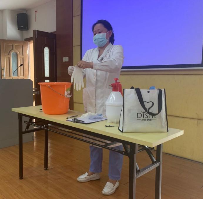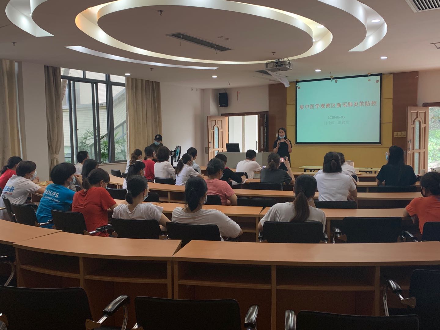 另一场设在南校的医学观察区,培训由门诊部洪锦兰就集中医学观察区新冠肺炎的防控进行了长达2小时的详细讲解和问题解答。洪锦兰结合医学观察区内所涉及的不同场所和不同岗位并结合最新的防控执行标准逐一给员工们进行了深入的讲解,让大家知其然而知其所以然,从而在获得知识的同时也化解了那份焦虑的心理。讲座结束后,门诊部汪俐又利用短短的20分钟给医学观察区工作人员进行了防护用品穿脱和消毒液配置的操作演练。