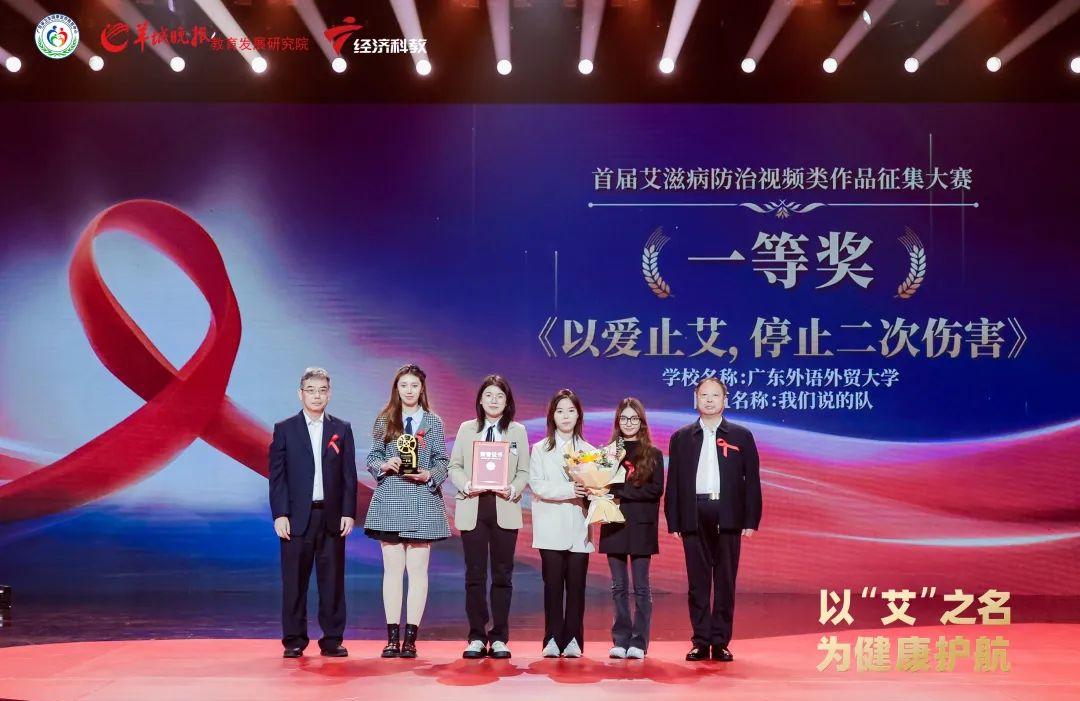 12月1日,广东广播电视台举办以“艾”之名,为健康护航——广东省2023年艾滋病防治宣传教育系列活动颁奖仪式。万佳音、易嘉颖、吴青冰、阿娅克孜·努尔太同学联合创作的《以爱止艾,停止二次伤害》荣获广东省首届艾滋病防治作品征集大赛短视频类一等奖。本项赛事在广东省卫生健康委员会、广东省教育厅、羊城晚报报业集团和南方财经全媒体集团的指导下,由广东省卫生健康宣传教育中心、羊城晚报教育发展研究院、广东经济科教频道联合主办,广东省疾病预防控制中心、广东省计划生育协会协办。