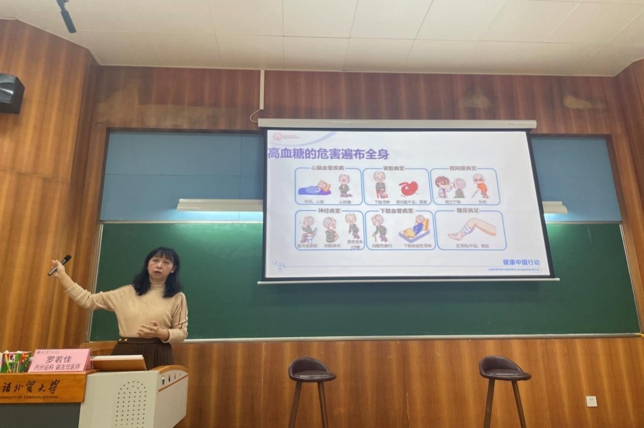 此次讲座的形式采取了主讲+健康互动分享相结合的模式举行,专家在讲座结束后进行现场义诊。为了更好的了解师生的健康需求及参加讲座的意愿,在讲座之前,学校运用问卷星收集了师生的健康问题及参加讲座的意愿。本次讲座邀请了南方医院白云分院内分泌科主任罗若佳作为主讲人。南方医院内分泌科主治医生范思铭、商英学院副院长汪谓超、东语学院党委副书记潘相宇与罗若佳主任一起作为健康互动分享嘉宾,结合本次讲座的主题《糖尿病并发症的预防 高血脂的危害》为本次讲座一一做精彩的健康分享。