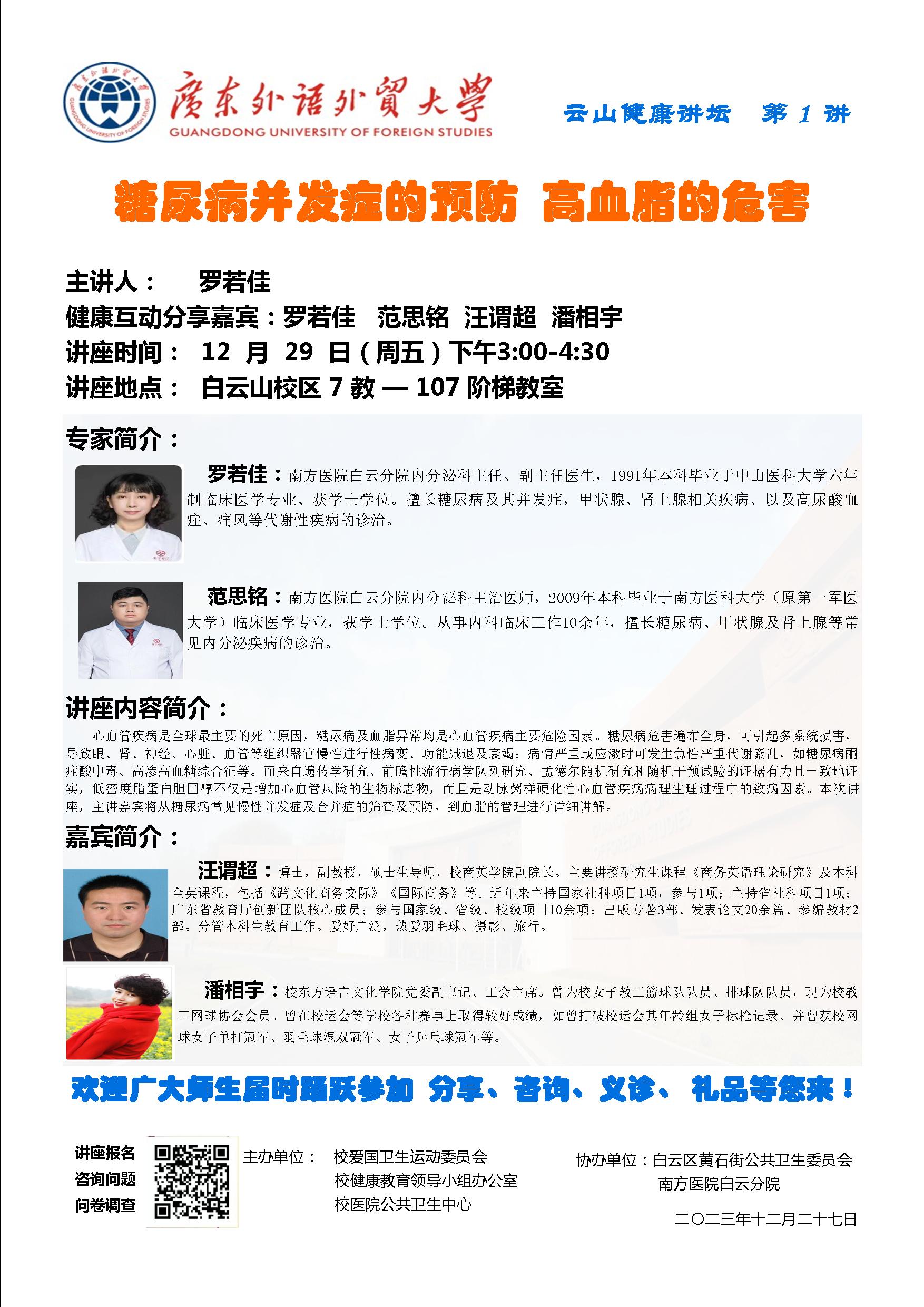 为了更好的关爱伟德国际victor1946师生健康、提高伟德国际victor1946师生的健康素养及幸福感,也为了更好的建设我们的健康学校,开展伟德国际victor1946的健康宣教工作,在总务后勤部的统一部署下,在校工会、学生工作部、教务部、离退休人员工作部等各部门的支持下,伟德国际victor1946云山健康讲坛于2023年12月29日下午在7教-107室开讲。本次讲座由校爱国卫生运动委员会、校健康教育领导小组办公室及伟德国际victor1946公共卫生中心主办,由黄石街公共卫生委员会及南方医院白云分院协办。讲座由伟德国际victor1946公共卫生中心副主任洪锦兰主持。