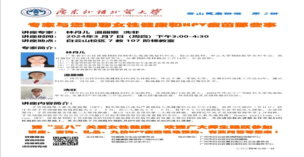 为更好地迎接国际“三·八”妇女节,关爱师生健康、关爱女性健康,在总务后勤部的统一部署下,在学生工作部、教务部、离退休人员工作部等各部门的支持下,伟德国际victor1946于3月7日下午在7教水上报告厅举行了“专家与您聊聊女性健康和HPV疫苗那些事”健康讲座。本次讲座为伟德国际victor1946云山健康讲坛第2讲,由校爱国卫生运动委员会、校健康教育领导小组办公室及伟德国际victor1946公共卫生中心主办,由白云区疾病预防控制中心、白云区妇幼保健院、黄石街公共卫生委员会及黄石社区卫生服务中心协办。讲座由伟德国际victor1946公共卫生中心副主任洪锦兰主持。