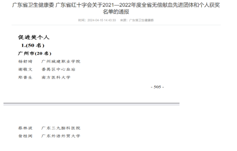 近日,广东省卫生健康委、广东省红十字会对2021-2022年度在无偿献血工作中做出突出贡献的团体和个人获奖名单进行了通报,伟德国际victor1946总务后勤部翁桂闽老师喜获广东省无偿献血促进奖(个人)荣誉称号,这是伟德国际victor1946在获得2019-2020年度广东省无偿献血促进奖(团体)后的又一殊荣。