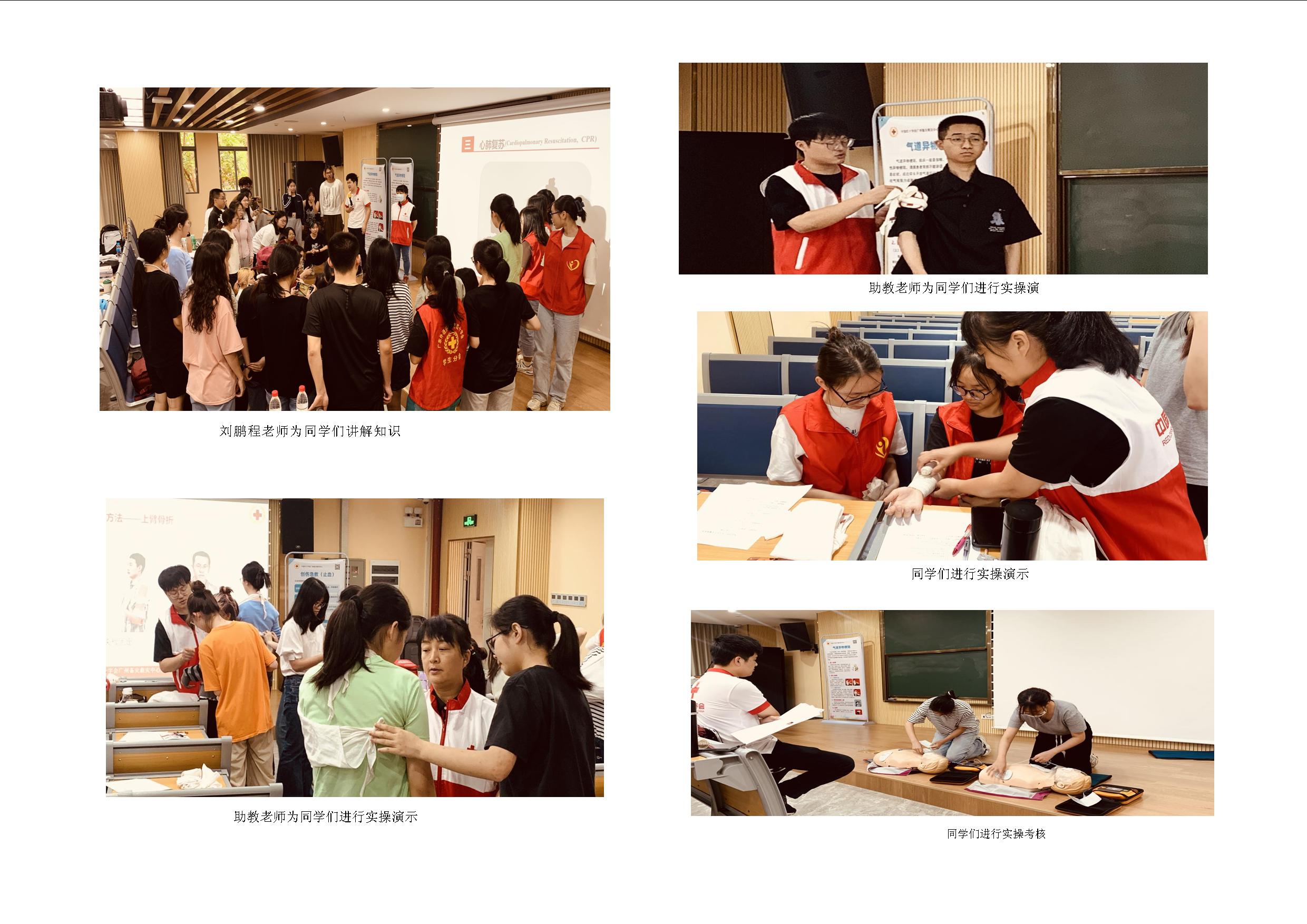 主讲老师刘鹏程为同学们讲解红会知识、心肺复苏、气道异物梗塞以及AED的使用等。随后助教老师们为同学们讲解创伤基本技术(止血、包扎、固定)、特殊伤情处理、烧烫伤等知识。