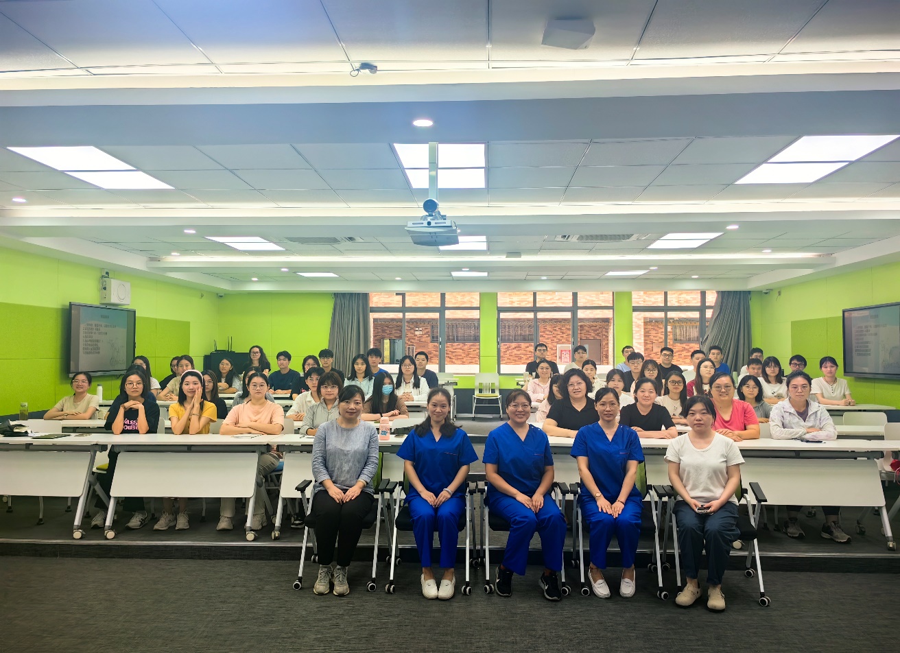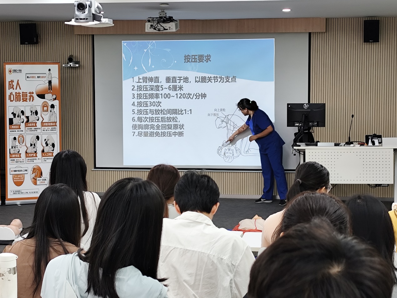 活动当日,现代化的教学设施与专业的医疗资源相得益彰,营造出一个高效互动的学习环境。伟德国际victor1946专业医护首先通过生动的多媒体演示,向同学们系统介绍了心肺复苏的基本原理、操作流程及技巧,深入浅出地讲授了心肺复苏术的每一个关键步骤,包括从识别心脏骤停迹象到实施高质量的心肺复苏,再到自动体外除颤器(AED)的正确使用。